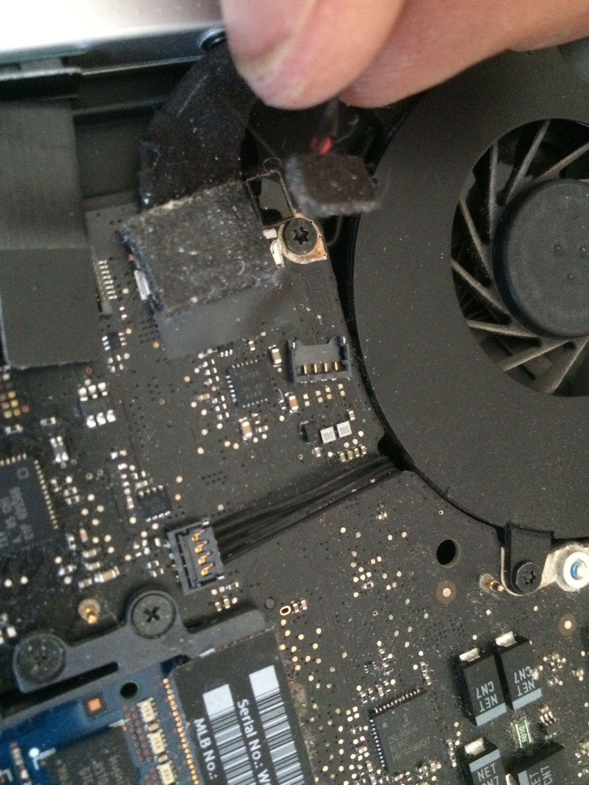 Replace the screws that secure the drive in place, and plug the cables back in. Make sure all the cables are securely attached back into their sockets. I found the cable closes to the fan, pictured here, the most difficult to connect. If any of these cables are not fully connected it obviously will not work when you turn the computer back on.